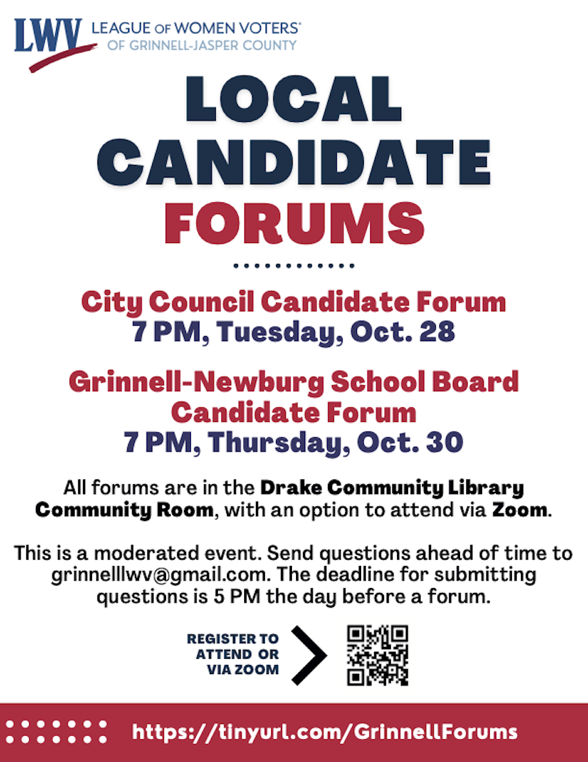 Both forums will be in person at Drake Community Library and over Zoom. Terese Grant will be the moderator. Each of the candidates will have an opportunity to present opening statements and will then answer questions. We ask that questions be submitted by 5:00 PM the day before the forum at grinnelllwv@gmail.com We will also have index cards available at the forum for questions but priority will be given to questions submitted before the forum.